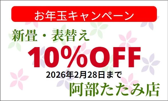 新畳、表替えの施工で10%OFFキャンペーンを2026年2月28日まで開催致します。